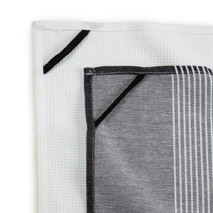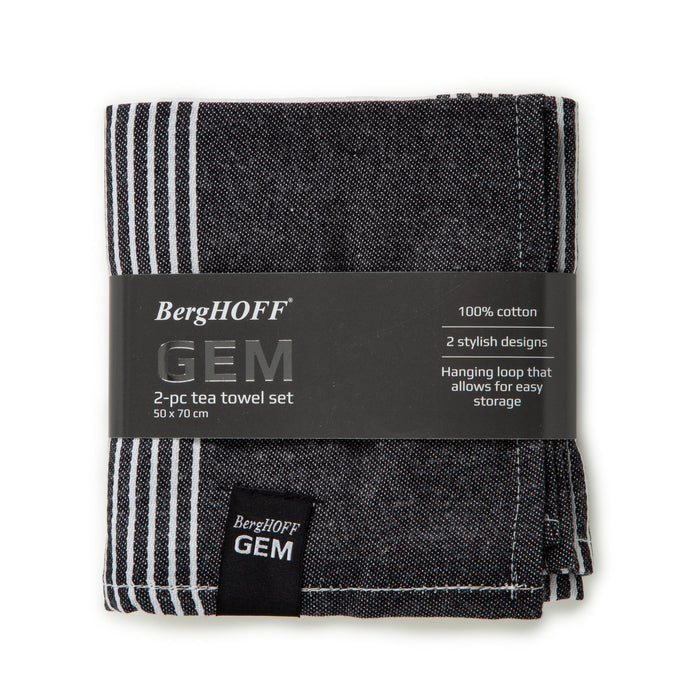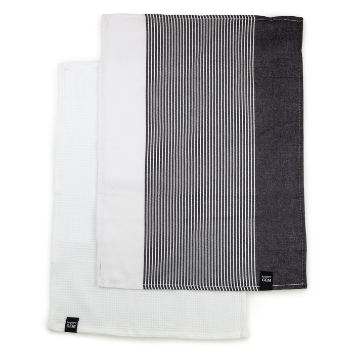 GEM Tea Towel Set. Whether you’re tackling dishes at home, in a bar or in the office kitchen, with this set of stylish tea towels you’re all set to dry those plates, cups and cutlery in a jiffy. The towels are both practical and stylish with 2 different designs in 100% cotton and a convenient loop that allows for easy hanging. When you’re done, just pop the towels in the washing machine for easy cleaning and you’re all set for the next round of dishes. Super absorbent and dry up quickly. Inspired by European design, featuring modern, simplistic and clean design, this product complements any kitchen décor. Set includes: 2x Tea towels 27.5" x 19.75"