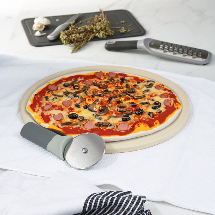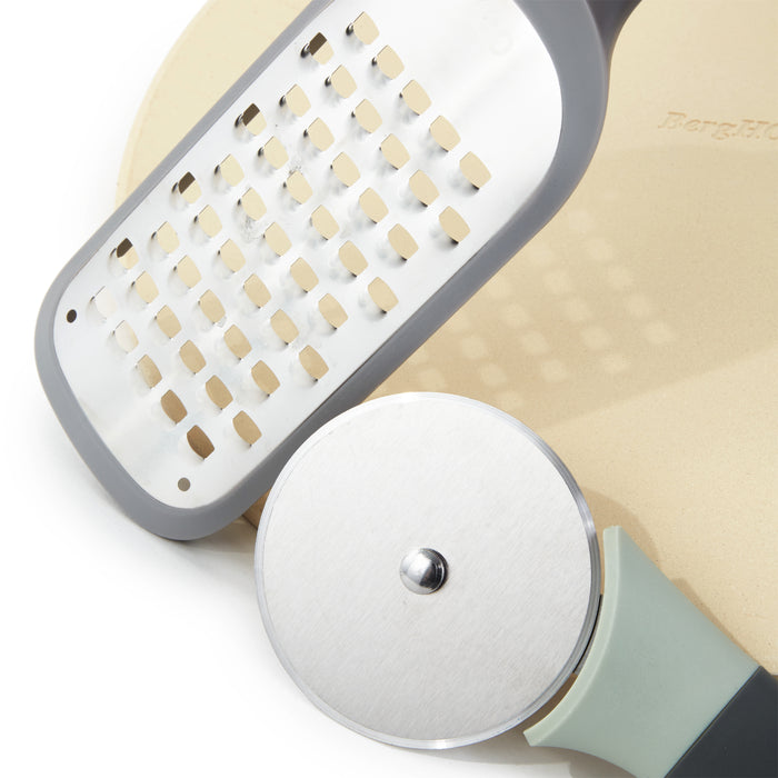 - This set includes cordierite 14" Pizza Stone, 7.5" Stainless steel Pizza Cutter, 10.75" 18/10 Stainless steel Ultra-Coarse Paddle Grater. Both tools are equipped with a PP and TPR overmold, ergonomic comfort-grip handle.