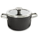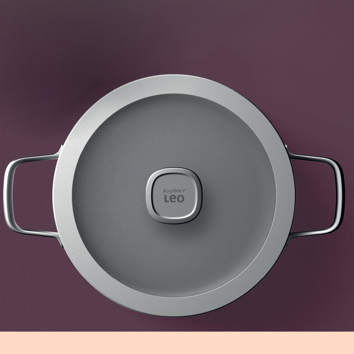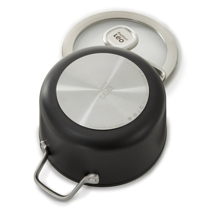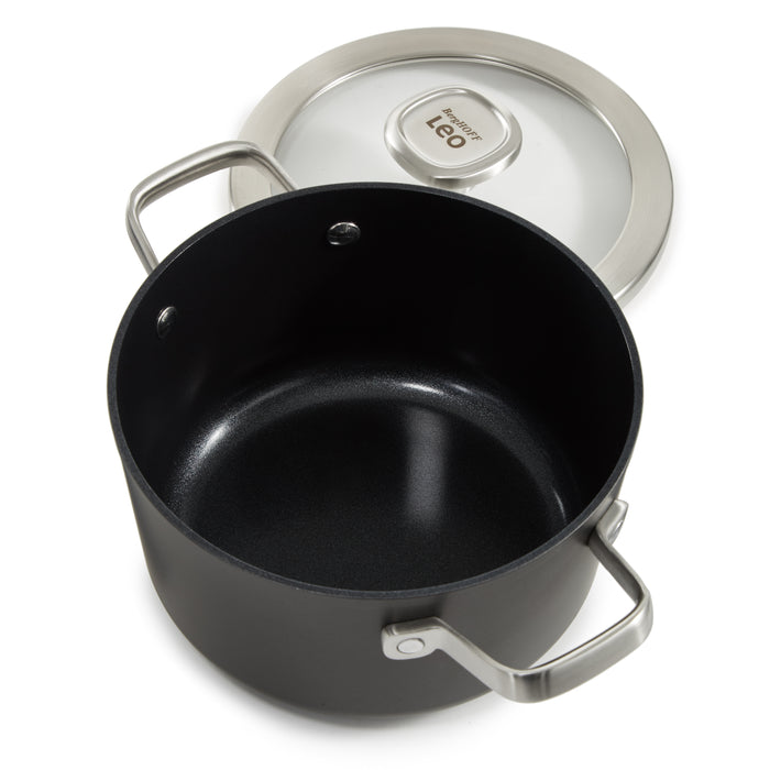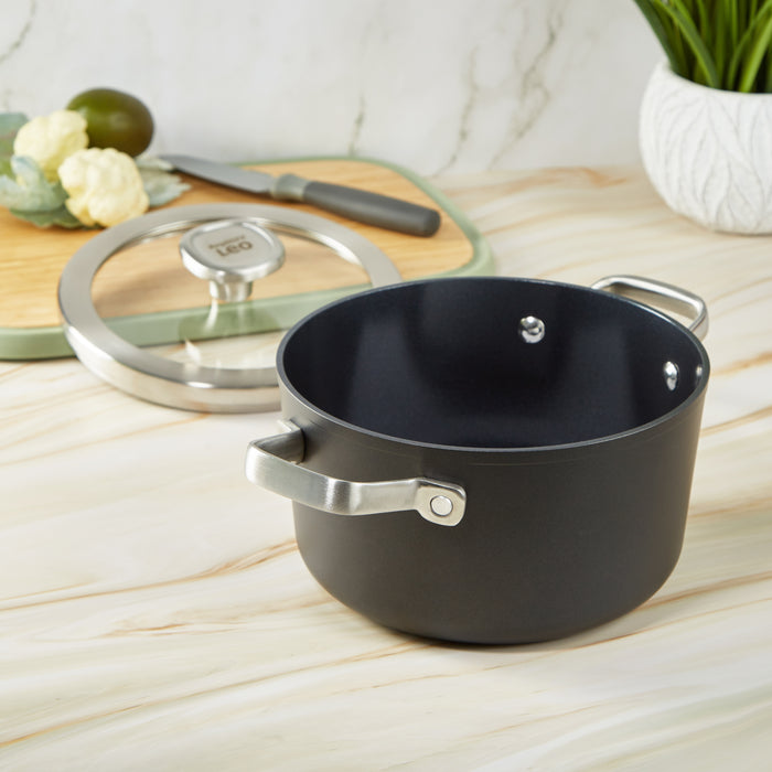 Leo Graphite 8" Stockpot 3.3qt. with glass lid combines lightweight durability with excellent heat conduction, making it your go-to for crafting rich, flavorful soups, stews, and sauces with ease. Made from lightweight 100% recycled aluminum and equipped with a high-quality, sustainable, and healthy CeraGreen ceramic non-stick, nontoxic, PFAS-free and PTFE-free, coating for easy food release and easy cleaning. This cookware range is a must-have in any kitchen. This pot conducts heat fast and evenly for an energy efficient performance, suitable for any kind of cooktop including induction, electric, gas, halogen, and vitro-ceramic. Ovenproof to 450°F. The glass lid with stainless steel rim is designed without a vent, that maintains the retention of foods' nutrients and taste by cooking them below the boiling point with medium to low heat. By preventing moisture and juices from escaping, the lid ensures your dishes remain flavorful and tender. Whether you're simmering sauces, boiling vegetables, or preparing soups, our stockpot is the perfect tool to achieve professional results in your home kitchen.