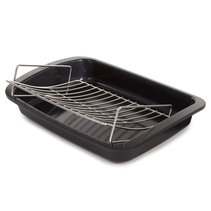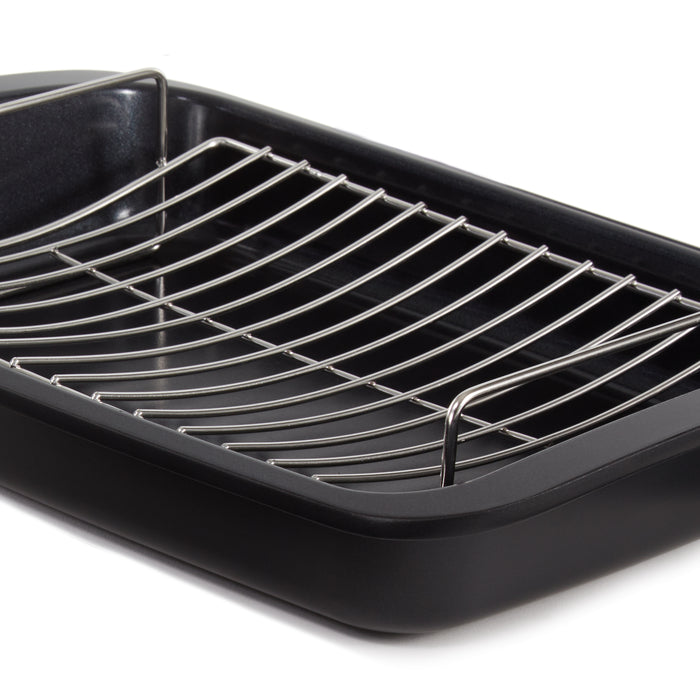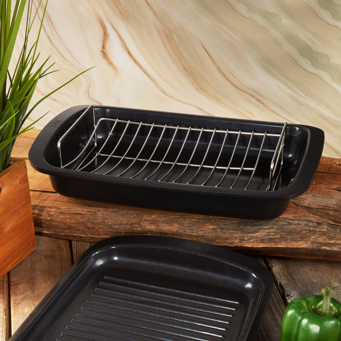 - Set includes Roaster 16.5" x 11" x 2.75", and stainless-steel rack 12" x 8.75" x 3". Made of recycled cast aluminum, equipped with high quality, sustainable and healthy CeraGreen non-stick ceramic coating and wide handles for a safe and secure grip.
