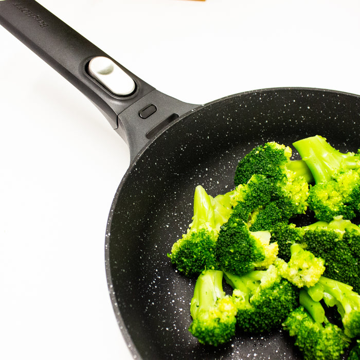 • Made of Non-stick Ferno-Green, PFOA Free coating Cast Aluminum. Easily detachable handle that allows for use in the oven and space-efficient storage. Glass lid with 18/10 Stainless Steel knob