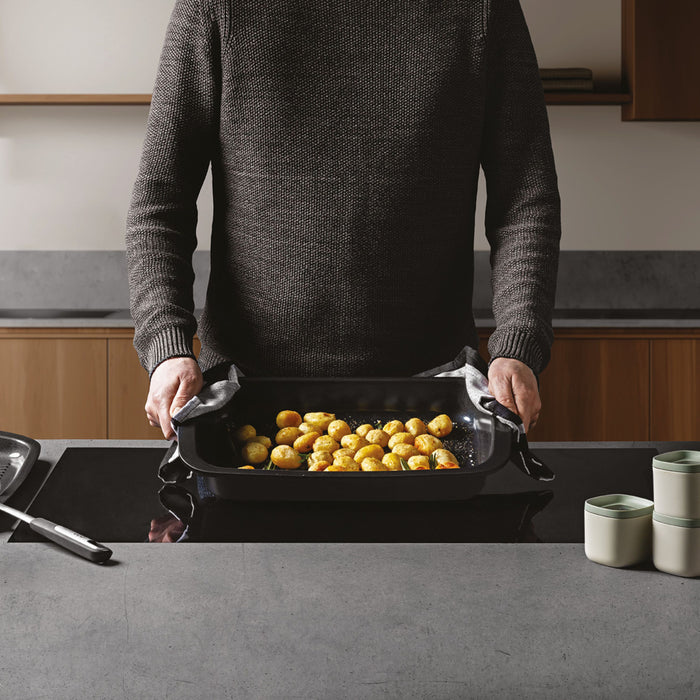 Leo Graphite 3Pc Roaster set is built with sustainable & healthy non-toxic, PTFE free, PFAS free non-stick CeraGreen ceramic coating, recycled cast aluminum for no oil, no fat cooking, suitable for all types of stoves. Want to bake a great and tasty chicken or small turkey? This set is a must-have. The recycled cast aluminum body and full disk bottom ensure fast, even, and energy efficient heat distribution. Compatible with a wide range of cooktops such as Induction, Electric, Gas, Halogen, and Vitro-ceramic, ovenproof up to 450°F. The ridged base of the grill pan allows fat to escape easily. Versatile cooking surface for grilling and searing food quickly at high temperatures. The removable rack is perfect to roast small turkey, chicken, ham. This roasting pan and grill pan are stackable for easy storage and two-layer cooking. This set includes Teppanyaki Grill Plate 12.75" x 8.25" x 1.5", Roaster 16.5" x 11" x 2.75", and stainless-steel rack 12" x 8.75" x 3".