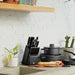 Want to expand your knife collection with some high-quality and sleek designed knives and matching knife block? The Leo Graphite 13Pc Knife Block Set is an ideal and highly functional solution to your everyday cutting needs. The knives are crafted from high-quality X50CrMov15 stainless steel with soft touch ABS handle. Its long and ergonomic handle offers a safe and comfortable grip. In the black rubberwood knife block, you can conveniently keep all these knives organized and within reach for your food preparation. This knife block also features a non-slip base, ensuring it stays securely in place on your countertop, providing stability and a strong grip. To make this set complete, we provided a storage space for the matching knife sharpener and santoku knife. The set includes Chef’s knife 8”, Bread knife 8”, Carving knife 8”, Utility knife 4.75", Paring knife 3.5", Poultry shears 9.75", 6-pc steak knife set 6.8" x 1.7" x 1.9", Knife block 9.5" x 7" x 5”.