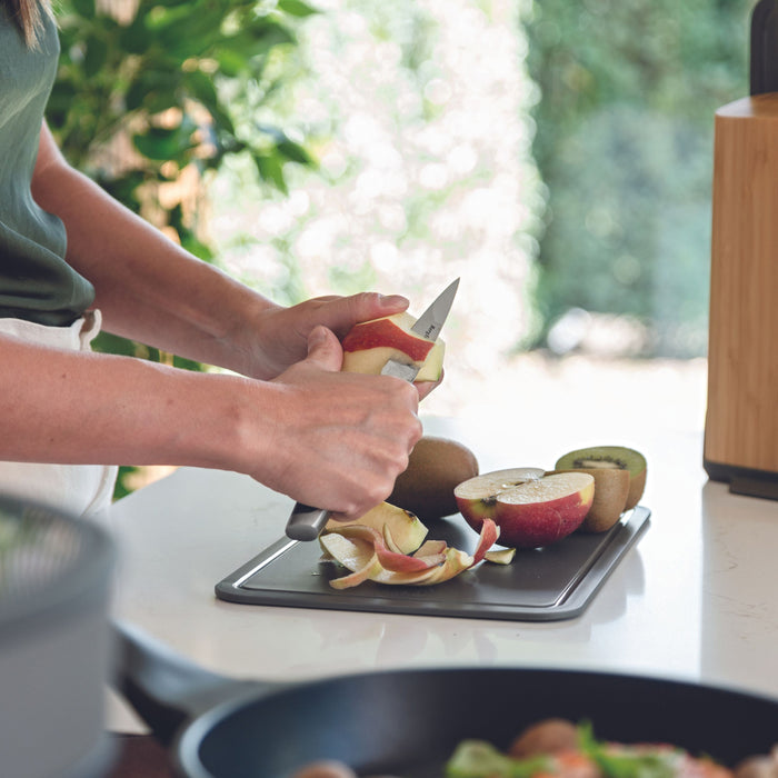 This Leo Legacy Stainless Steel Paring Knife 3.5" is made of high-quality stainless steel that not only stays sharp for a long time but is also very easy to maintain. This static knife has a seamless transition from the stainless steel blade to the matching stainless steel handle. The hollow handle provides you with a comfortable and safe grip. This ultimate paring knife is perfect to peel a hot potato, cutting thin julienne strips or deveining shrimps. Its smaller stainless-steel blade excels at precision tasks, with its pointed tip suitable for testing vegetable or meat tenderness and removing chili pepper seeds. The knife is part of an all-in 1 knife block with integrated knife sharpener and accompanying cutting boards.