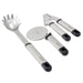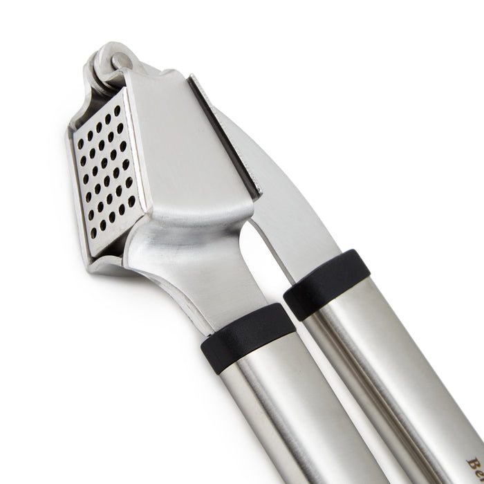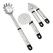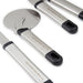 - Stainless steel Pizza Cutter, Pasta Spoon, and Garlic Press with long, ergonomic handles.