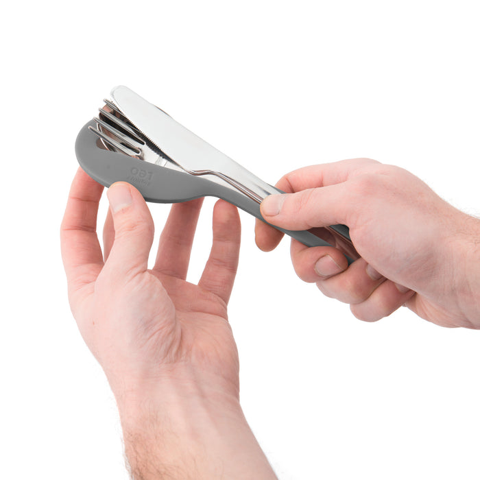 You're always prepared for meals on the go with this convenient Leo travel flatware set, comprising forks, spoons, knives, and silicone sleeves for utensil storage. Offering a durable and sustainable alternative to disposable cutlery, this set is ideal for two people on-the-go. When it's mealtime, simply take out the stainless steel knife, fork, or spoon from their sleeves and savor a delightful lunch or snack. These utensils are crafted from high-quality 18/10 stainless steel, while the sleeves are made of heat-resistant silicone, ensuring a long-lasting set with proper care. Their compact size enables easy storage in kitchen drawers and fits effortlessly into any lunch bag. After use, cleaning is a breeze – just place the cutlery in the dishwasher. This set includes two sets of Knife 7", Spoon 7", Fork 7", and 2x Silicone Sleeves in pink and grey color.