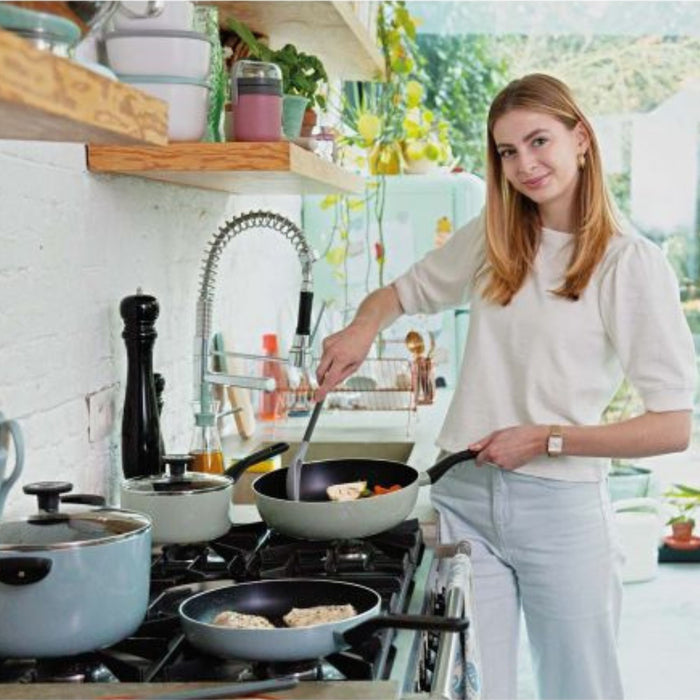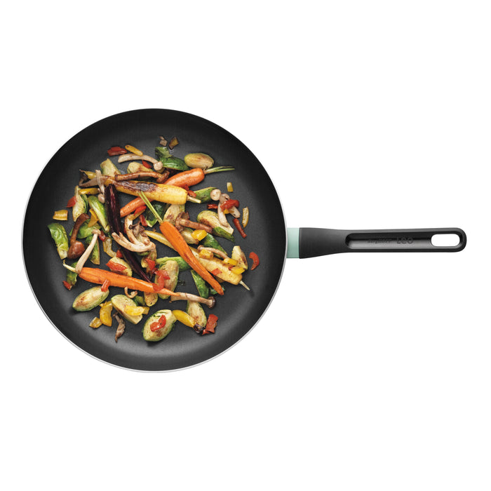 Browning a large quantity of fish or meat for your family party? Then you’ll absolutely love the large cooking surface of this Leo Sage 12.5" frying pan which can be used on any kind of stovetop, including induction. The lightweight Aluminum ensures you of fast and even heat distribution for energy efficiency. The high-quality FernoGreen, PFOA-Free, non-toxic, non-stick coating allows you to cook with little to no oil for healthier cooking and ensures easy food release after your cooking party. The glossy phenolic resin handle provides you with the convenience of moving the pan easily and safely. The matching colors Sage and Slate in this Leo collection allow you to combine the different sizes of frying pans in both colors.