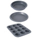 - Set comes with non-stick Carbon steel 10.75" cake pan, 12.5" pie pan, and 12-cup muffin pan with non-toxic, FernoGreen coating.