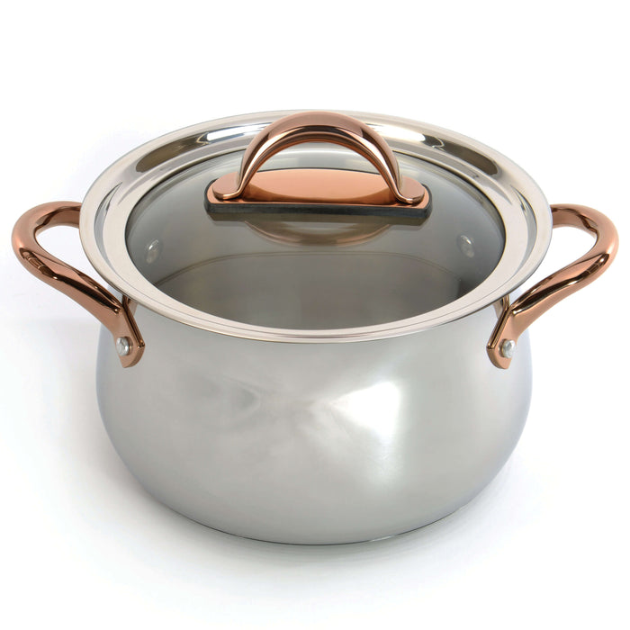 - Package includes: 9.5" Stockpot 8.1qt with Glass Lid, Rose Gold Handle. Elevate your cooking experience with our eco-friendly stockpot, made with high-quality 18/10 Stainless Steel with a sleek mirror finish and features ergonomically designed rose gold handles for a firm, secure grip.
