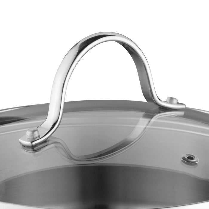 - Made of 18/10 Stainless Steel with Mirror finish, Safe grip handle, Glass lid with integrated steam vent. Quick to heat, even heating Stainless Steel construction