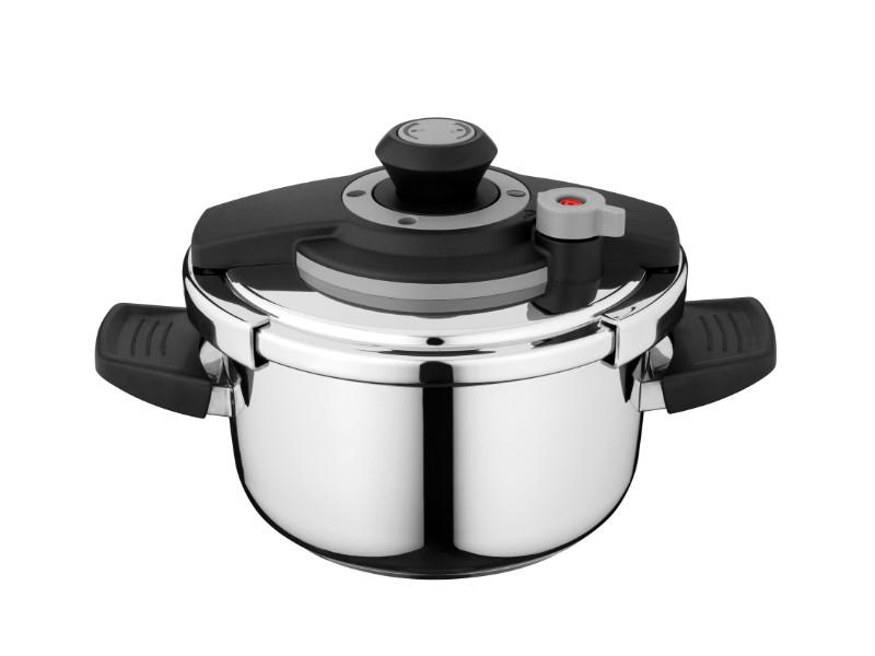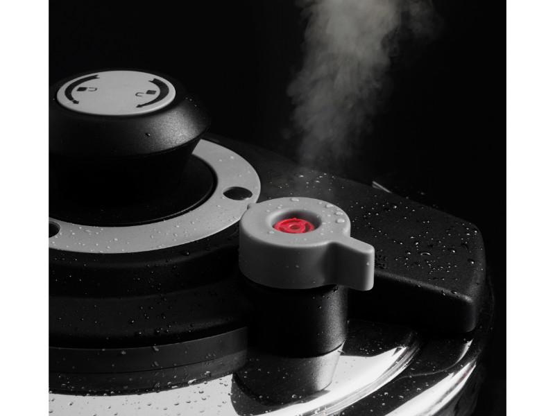 - Quick-release and open-lid regulator with stay-cool handle, the lid lock and overpressure plug