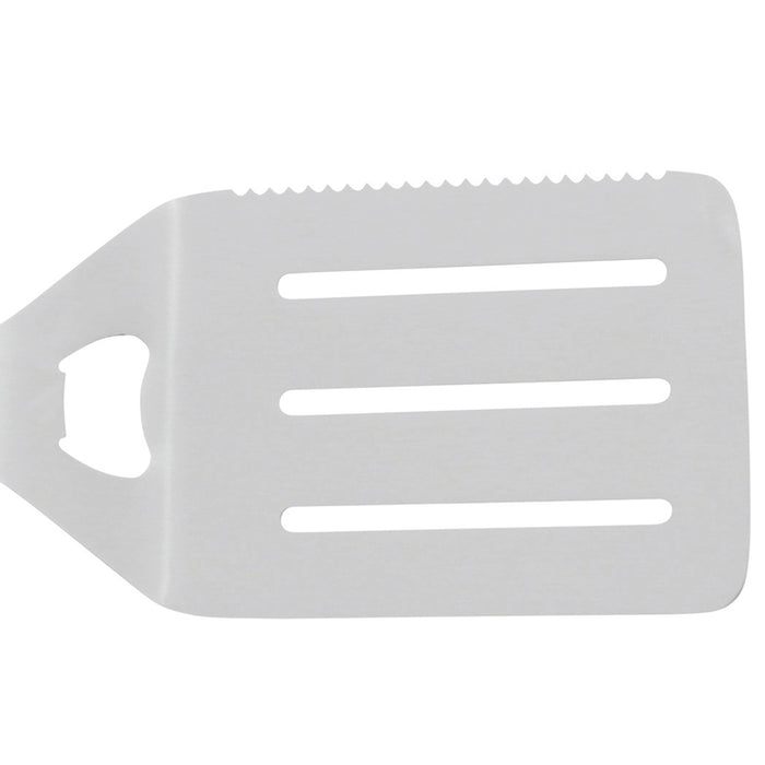 Flipping a burger, a steak or a larger piece of meat on the grill is a piece of cake with this spatula made of high-quality stainless steel. The serrated edge allows you to test the food for doneness while the head easily slides under the food to turn it or take it from the grill. No need to worry about hand burns thanks to the spatula’s long handle that keeps your hands safely away from the grill and is covered in crack-resistant wood. When you’re not using the spatula you can easily store it within reach with the help of the hook on the handle.