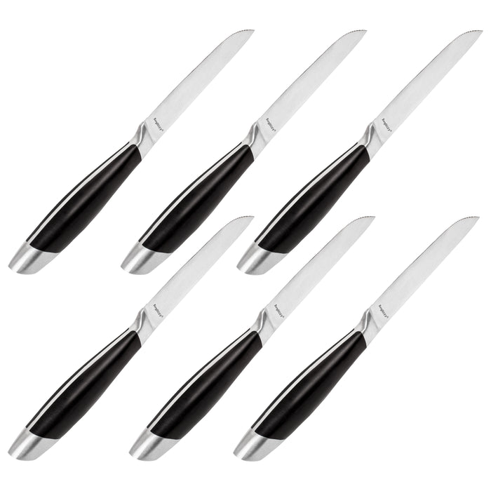 - 6x 18/10 Stainless steel steak knives with ABS handles, satin finish.
