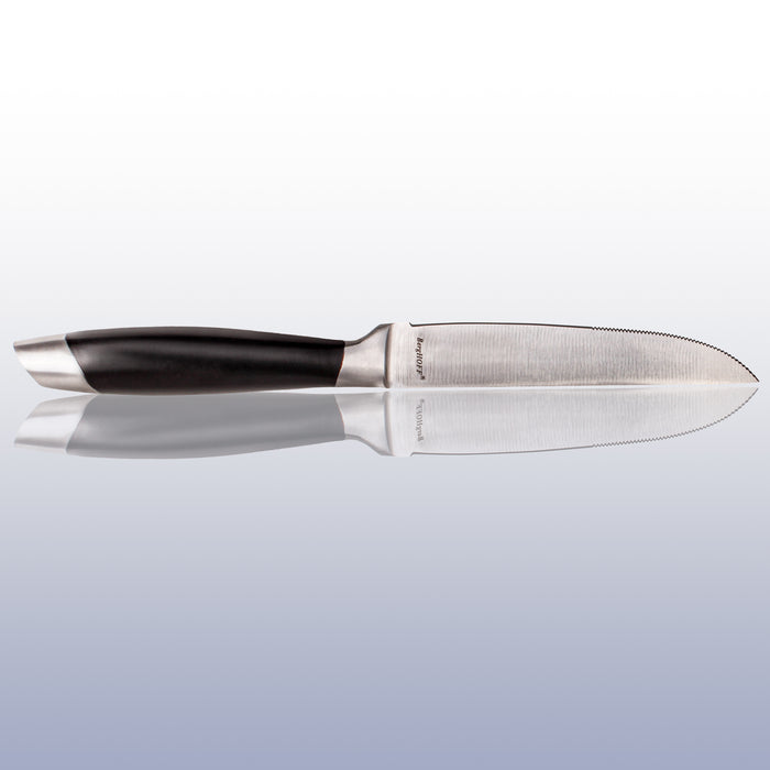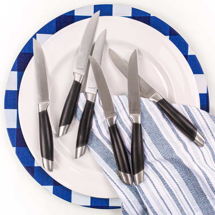 Geminis 6x Steak Knife Set is a set that feels good to use, cuts like a hot knife through butter and adds to the aesthetic of mealtime. Made with powerful stainless steel blades honed for precision and accuracy and complete with a comfortable triple riveted handle, this knife set is truly an asset to your dining experience. Durable stainless steel blades ensure precision and accuracy. Designed to effortlessly slice through even the toughest cuts of meat. The serrated edges ensure a clean and precise cut every time, making them perfect for steak dinners, barbecues, and special occasions. This steak knife set is a must-have for mealtime. Package includes: 6x 5" Steak knives