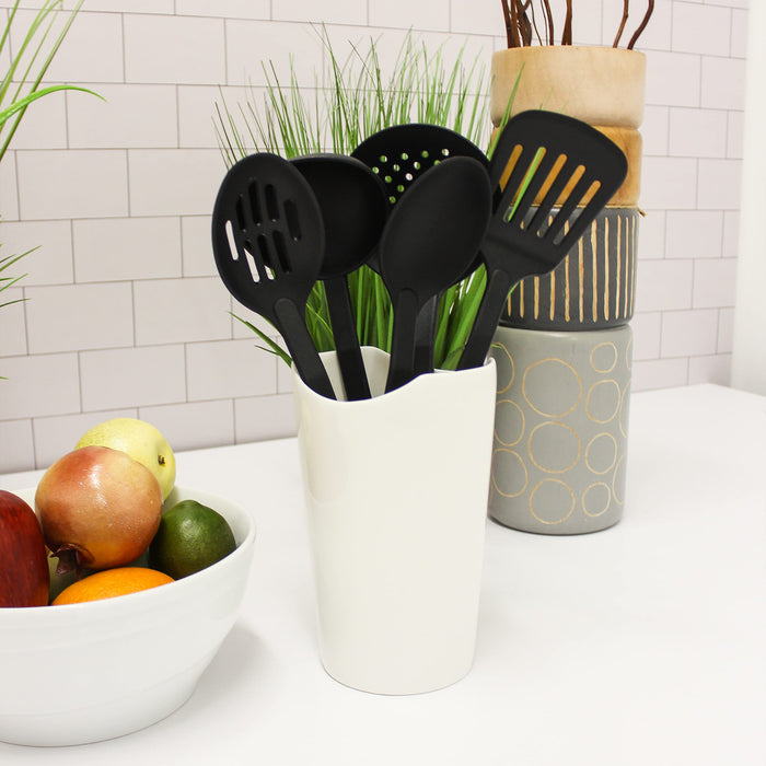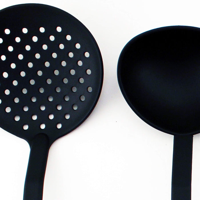- Lightweight nylon skimmer, slotted turner, slotted spoon, solid spoon, ladle with ergonomic handles.