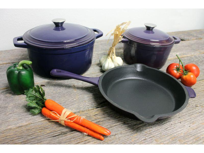 • Package includes: 8" Round Dutch Oven 3qt, 10" Fry Pan, 11.5" Oval Dutch Oven 5qt, 2x Lids. Upgrade your kitchen essentials with our eco-friendly dutch oven set, made of durable and high quality cast iron featuring a glossy base with enamel coating and wide, ergonomic handles for a safe and secure grip. Includes matching vapor seal lids.