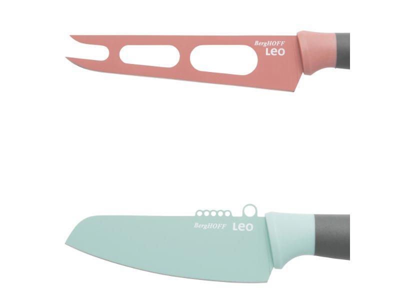 Vegetable knife with zester mint , Cabbage, salad, eggplants, ect,... you name it, the Leo vegetable knife will help you to slice, dice, chop or trim it. The mint colored blade with non-stick coating glides right through all kinds of vegetables while the integrated zester allows you to add a fruity touch to your dishes as it zests limes, lemons and other citrus fruits with minimum effort. The knife comes with a protective sleeve for safe storage. Cheese Knife Pink, Having a wine and cheese night? The pink Leo cheese knife is the perfect assistant to help you cut and serve a selection of delicious cheeses. The stainless steel blade cuts through hard cheese but is also fit for soft cheese that won't stick to the blade thanks to the cut out sections. Once you've sliced the cheese, use the convenient fork-tipped spear for serving.