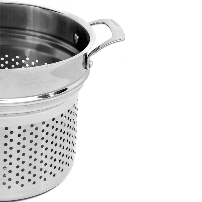 - Tri-ply 18/10 Stainless Steel 9.5" Pasta Strainer Insert featuring a resistance to rust, corrosion, and staining, making it a long-lasting investment for your culinary needs. Mirror finish with wide, ergonomic double-riveted handles.