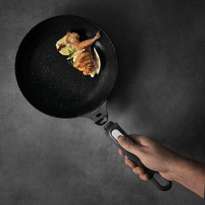These GEM pans have all you need for a great cooking performance: they are easy to clean thanks to the non-stick coating, have a lightweight frame for convenient handling and a detachable handle for versatile use. With a swift, single-handed move you snap off the handle to use your pan in the oven or wash up after cooking. The choice is yours; cook on the hob, pop it in the oven, serve directly on the table or store leftovers in the fridge!