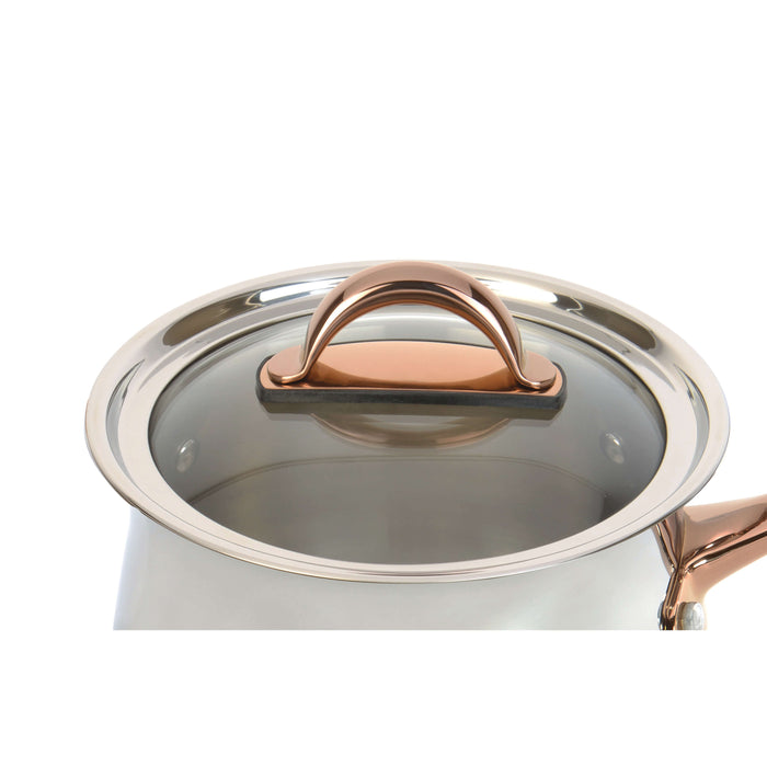Ouro Gold 6.25" Saucepan 2.5qt. with glass lid is crafted from high-quality, durable 18/10 stainless steel, combining sustainable design with top-notch performance. The saucepan features elegant rose gold handles for a secure and comfortable grip. Its 3-layered base ensures efficient heat distribution, while the glass lid allows you to monitor your cooking without lifting the lid, helping to retain moisture and flavor. Whether you need to simmer sauces, boil vegetables, or even make soups or stew, this saucepan is designed to meet all your culinary needs. Suitable for all cooktops, including Induction, Electric, Gas, Halogen, Glass Top and Vitro-ceramic, this eco-friendly saucepan delivers energy-efficient cooking and versatility for a wide range of dishes. Hand wash only.