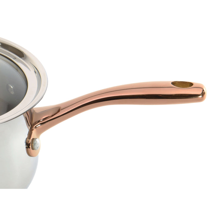 - Package includes: 6.25" Saucepan 2.5qt with Glass Lid, Rose Gold Handle. Cook with ease using our saucepan, made of high-quality 18/10 Stainless Steel with a sleek mirror finish and features ergonomically designed rose gold handles for a firm, secure grip. Save valuable kitchen space utilizing the hanging loop and store your cookware within reach.