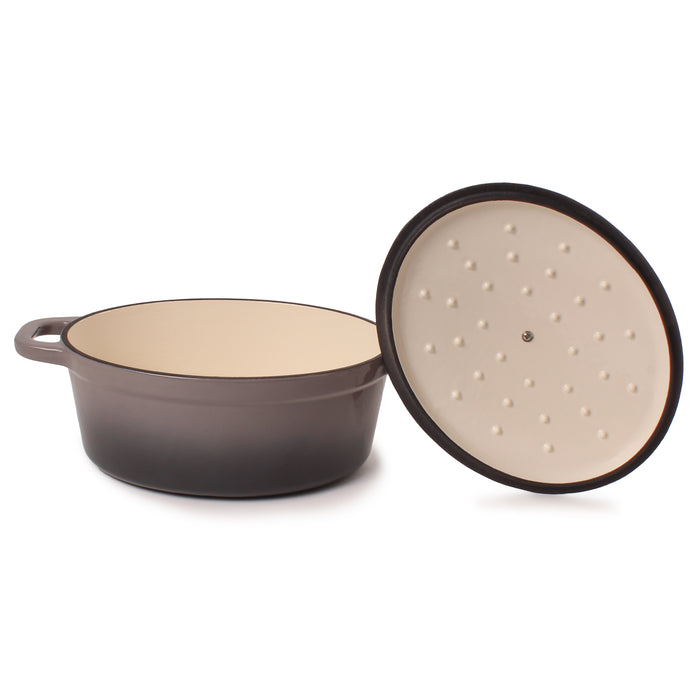 - 11.5" Oval Dutch Oven 5qt with Lid is made of durable cast iron, featuring an enamel coating both inside and outside and a glossy base. Includes a matching lid and wide, ergonomic handles for easy handling. The enameled surface ensures minimal sticking and staining, eliminating the need for preseasoning and promotes a fast and easy cleanup process.