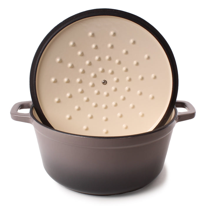 - This dutch oven features a vapor seal lid that is designed without a vent, retaining all the nutrients, vitamins, moisture, and taste during the cooking process. The condensation bumps under the lid help create a self-basting effect, eliminating the need for excess water, making it a more efficient and eco-friendly cooking option.