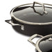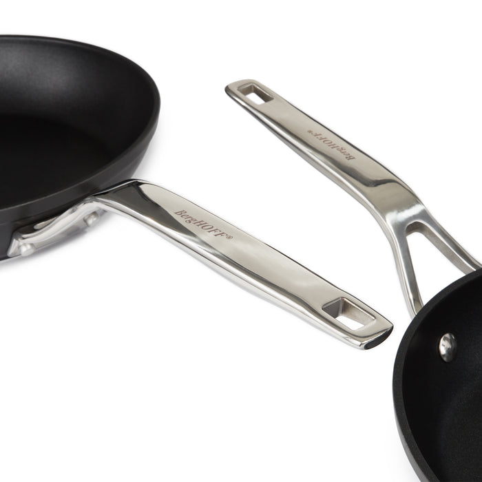 BergHOFF's Essentials hard anodized cookware for exceptional functionality and bold beauty. Cook with ease using this Essentials versatile cookware. Constructed from hard-anodized aluminum body with BergHOFF's FernoGreen nonstick coating, 100% Non-Toxic and does not contain PFOA, GEN-X, BPA, APEO, NMP or PFOS for healthier no-oil or low oil cooking and make it easy to clean. Designed with full disk bottom to avoid scratches on your glass top cooktop and to ensure rapid, even heat distribution for energy-efficient cooking. Featuring polished stainless steel and ergonomic handles. The glass lid with stainless steel rim and venting hole ensures you of keeping an eye on the food while cooking. Suitable for any kind of stovetop including induction, oven safe up to 450°F. BergHOFF's cookware is built to withstand heavy use with a fast, simple cleanup. This set includes Frying Pan 8" and 10", 6.25" saucepan 1.3qt., stockpot 3.3qt., stockpot 5.3qt., deep skillet 4.3qt., 4x glass lids.