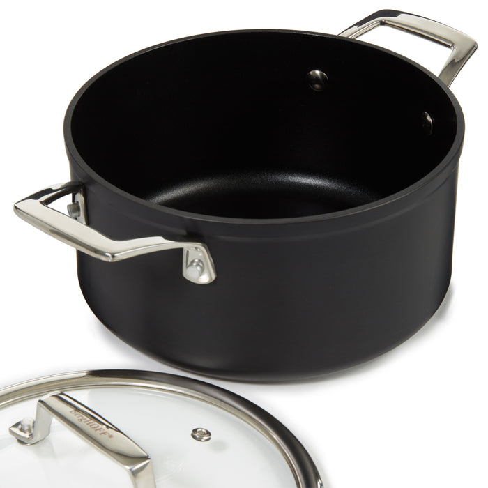 - 8” Stockpot 3.3qt., and glass lid is made from top-tier hard-anodized aluminum with FernoGreen non-stick coating. Glass lid features a steam vent. Ergonomic stainless steel comfort-grip handle offers a safe and comfortable grip for secure lifting.