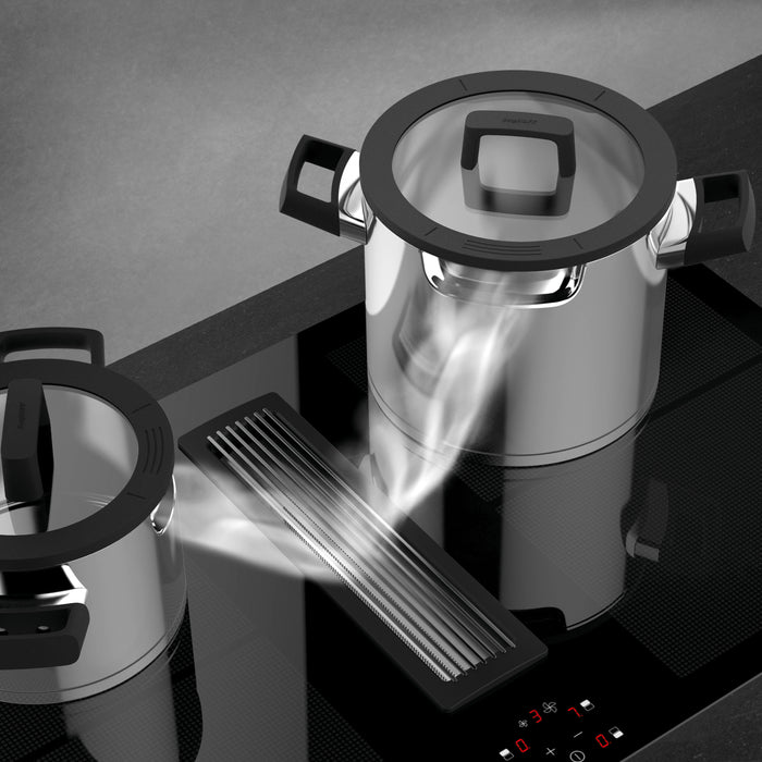 • Patented design and perfect fit for all downdraft systems and regular cooktops. Possibility to close off the pot by rotating the lid 180 degrees.
