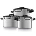 This cookware set has a lid allows for a controlled steam release from the body of the pan, letting you direct the steam to your downdraft exhaust system. You can rotate the lid to lock in steam and speed up the cooking process. Features stay cool handles for stay, comfortabe handling.