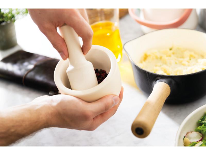 - With its user-friendly design and stylish satin finish, this mortar and pestle provides functionality and adds a touch of elegance to your kitchen. Its durable, heavy-duty body can withstand the pressure of grinding hard ingredients, while the pestle is large and easy to grip, making it comfortable to use for extended periods of time.