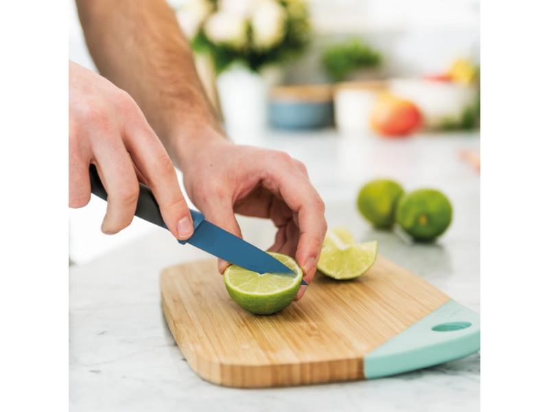 With its sharp edge and comfortable soft-touch handle, the Leo paring knife is the perfect helper for small kitchen tasks such as mincing onions, peeling apples or segmenting oranges. Use it to work on a cutting board or simply hold the ingredient in your hand and start cutting. The stainless steel blade with non-stick coating glides right through your favorite fruits and vegetables and is easy to maintain.