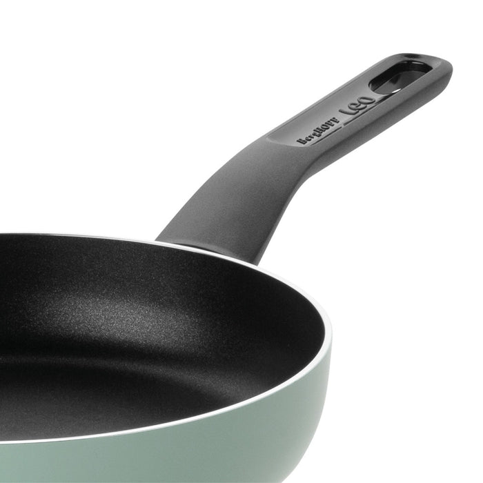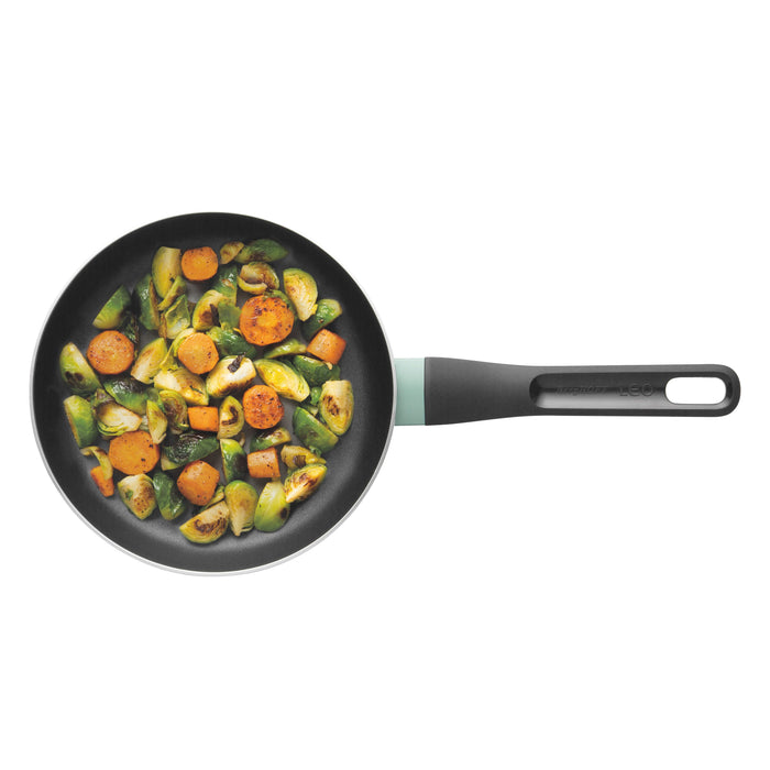 This ideally sized Leo Sage fry pan 8" is tailor-made to assist in the preparation of either your breakfast in the morning or your evening meal at night. The Aluminum body for heat distribution and the playful colors to brighten up your kitchen are the perfect combination to start cooking your daily meals. Thanks to the high-quality FernoGreen, PFOA-Free, non-toxic, non-stick coating, you need little to no oil for healthier cooking and makes the pan easy to clean. The glossy phenolic resin handle ensures you to safely take the pan from the stove to the dinner table. On top of that, the frying pan can be used on any kind of stovetops, including induction. The matching colors Sage and Slate in this Leo collection allow you to combine the different sizes of frying pans in both colors.