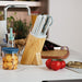 • The knives feature a full tang, stain and corrosion resistant construction, ensuring that these knives will maintain their pristine appearance even after prolonged use. The nonslip, comfort grip handle provides a secure and ergonomic hold while the double rivets provide extra stability and longevity. It's matching knife block features a nonslip, nonskid base, ensuring that your knives stay securely in place.