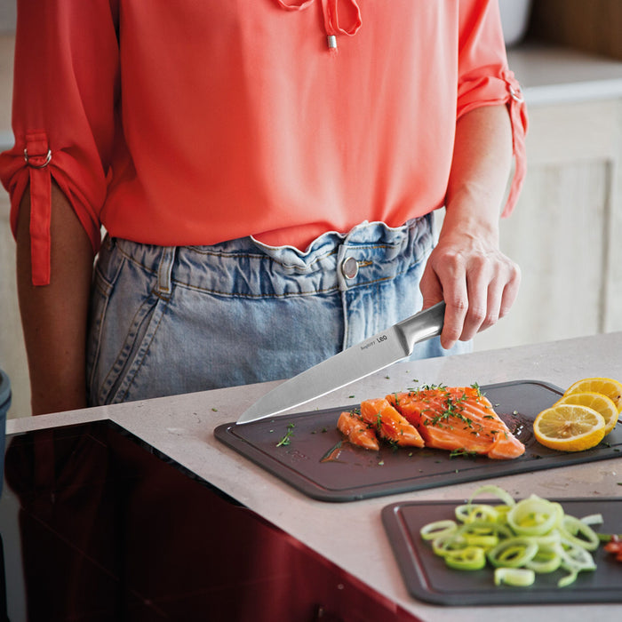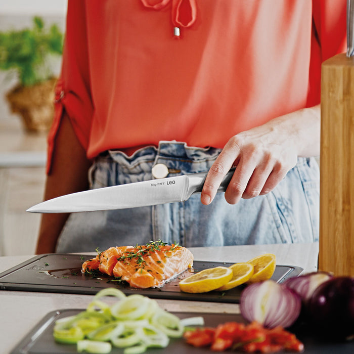 This Leo Legacy Stainless Steel Carving Knife 8" is made of high-quality stainless steel that not only stays sharp for a long time but is also very easy to maintain. This static carving knife has a seamless transition from the stainless steel blade to the matching stainless steel handle. The hollow handle provides you with a comfortable and safe grip while cutting meat. This carving knife is a specialized tool with a long, thin blade, ideal for precisely slicing and serving meats, making it a perfect choice for family gatherings and special occasions. This knife is part of an all-in1 knife block with integrated knife sharpener and accompanying cutting boards.