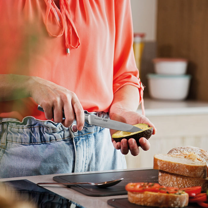 This Leo Legacy Stainless Steel Utility Knife 5" is made of high-quality stainless steel that not only stays sharp for a long time but is also very easy to maintain. This static utility knife has a seamless transition from the stainless steel blade to the matching stainless steel handle. The hollow handle provides you with a comfortable and safe grip. The utility knife, known for its compact size and sharp blade, serves as a reliable multi-purpose tool, suitable for a variety of cutting and slicing tasks in the kitchen. The knife is part of an all-in1 knife block with integrated knife sharpener and accompanying cutting boards.