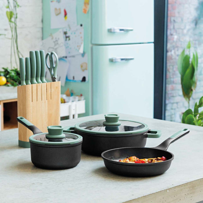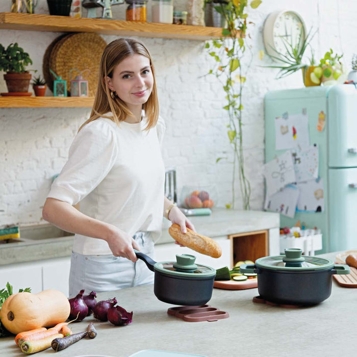 Whether you’re cooking for one, making a side dish or preparing a savory sauce, this Leo Forest covered saucepan 7” with matching glass lid is a great kitchen essential. Crafted from high-quality cast Aluminum ensures everything heats up quickly and evenly on any cooktop, including induction for energy-efficient, while the clear glass lid with drain hole for easy straining and allows you to keep an eye on your food without having to lift the lid. Integrated spoon rest function on the lid keeps your kitchen surfaces clean while cooking. The silicone rim around the lid is to prevent rattling, also drip-free pouring while the silicone in lay on the pot's handle provide a safe and comfortable grip. On top of that, with its high-quality FernoGreen, PFOA-Free, non-toxic, non-stick coating for healthier cooking with low to no oil and ensures easy food release. The matching colors stone and Forest in this Leo collection allow you to combine the different sizes of pots and pans in both colors.