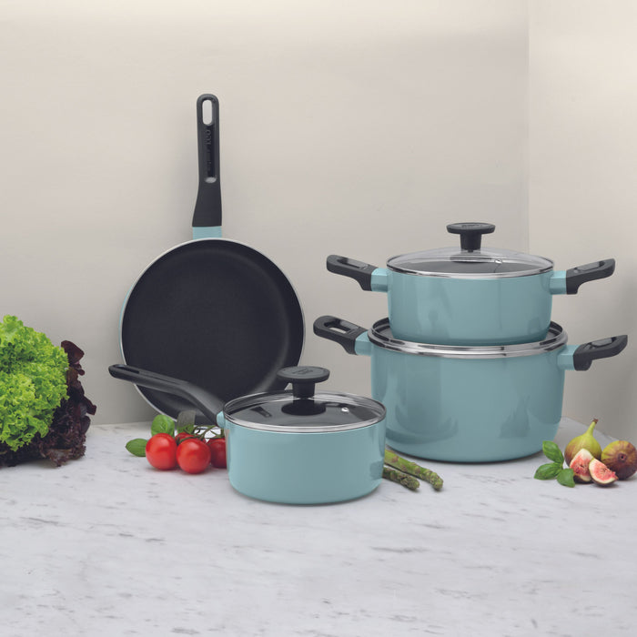 Brighten up your kitchen with this versatile Leo Slate 7Pc cookware set. All pots and pans are made from Aluminum with a colorful outside finishing. This set allows you to prepare a wide variety of recipes. This lightweight cookware set is equipped with a high-quality FernoGreen, PFOA-Free, non-toxic, non-stick coating provides you with the convenience of using little to no oil, and for easy food release and clean up. The glass lid with stainless steel rim and venting hole ensures you of keeping an eye on the food while cooking. Glossy phenolic resin stay-cool handle ensures you to safely take the pan from the stove to the dinner table. On top of that, the frying pan can be used on any kind of stovetops, including induction. Matching colors between this Sage and Slate range allow you to combine the different pans in both colors. This set includes covered Saucepan 7", covered Stockpot 3qt., covered Stockpot 5.9qt., and Frying Pan 9.5".
