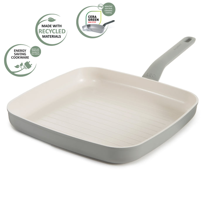 Leo Balance square grill pan 11” is built with sustainable and healthy non-toxic, PTFE free, PFAS free non-stick CeraGreen ceramic coating, recycled aluminum and stay-cool handle for no oil, no fat cooking, suitable for all types of stoves. A couple of perfectly seared steaks, fish filets or a variety of vegetables, it’s a piece of cake with this 11" grill pan! It’s made from robust, yet lightweight 100% recycled Aluminum and can be used on any kind of stovetop, including induction. The grill pan’s stay-cool handle ensures a comfortable and safe grip while the raised grill lines leave those typical grill marks and allow any fat and moisture to escape easily so you get that extra crispy result. An added bonus is the high-quality, sustainable, and healthy ceramic non-stick coating that guarantees easy food release and makes the clean-up a breeze.