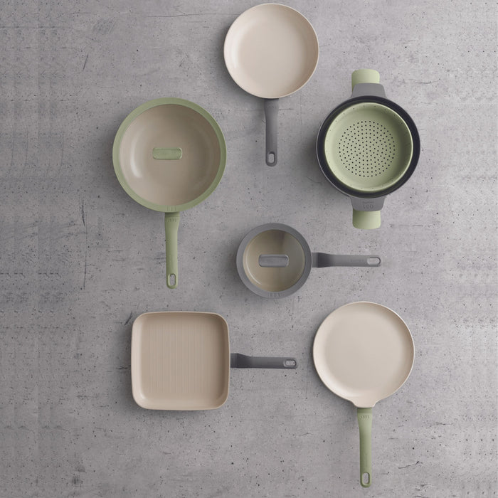 Leo Balance Frying Pan 8" built with sustainable & healthy non-toxic, PTFE free, PFAS free non-stick CeraGreen ceramic coating, recycled aluminum and stay-cool handle for no oil, no fat cooking, suitable for all types of stoves. This ideally sized fry pan is tailor-made to assist in the preparation of either your breakfast or your dinner. This pan's surface provides ample space to prepare a wide variety of dishes. With its 100% recycled Aluminum body that guarantees a fast and even heat distribution and it’s high-quality, sustainable, and healthy ceramic non-stick coating, this pan allows you to fry with little to no oil. This pan ensures an energy efficient performance on any kind of hob, induction included. On top of that, the sturdy stay-cool handle that’s soft to the touch provides a good grip so you can safely take the pan from the hob to the table for serving.