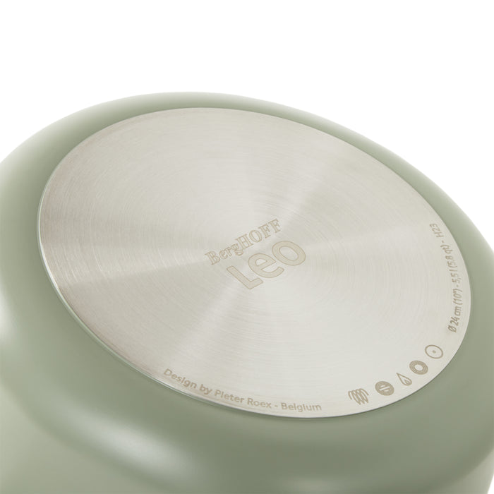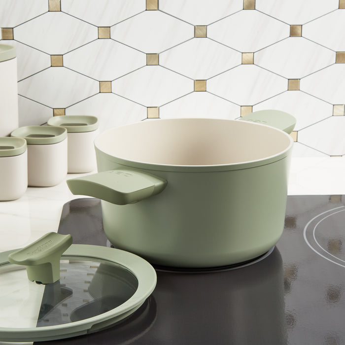 Leo Balance Stockpot 10", 4.6qt. is built with sustainable and healthy non-toxic, PTFE free, PFAS free non-stick CeraGreen ceramic coating, 100% recycled aluminum and stay-cool handle for no oil, no fat cooking, suitable for all types of stoves. Want to boil a batch of pasta, make your favorite soup, or slow-cook a stock? Then you’ll need a stockpot you can count on! The Aluminum body and flat disk bottom ensure fast, even, and energy efficient heat distribution. The clear glass lid that lets you keep an eye on your food and comes with an integrated drain hole for easy straining while the spoon rest function keeps your cooktop and table clean while cooking or serving dinner. When you’ve finished cooking, just grab the stay-cool handles, and easily take the stockpot to the table to serve up your latest culinary creation.