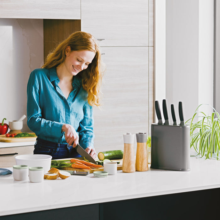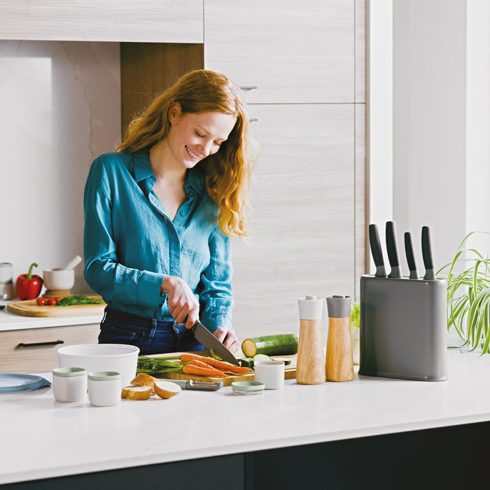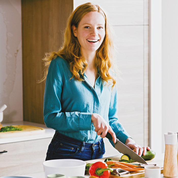 This Leo Balance Non-stick Stainless Steel Chef's Knife 7.5" is one of the most important tools in any kitchen. Meat, vegetables, or poultry, this knife cuts it all and thanks to the wide, sharp blade it’s also suitable for light cleaving jobs. This lightweight knife is crafted from high-quality stainless steel with recycled soft-touch handle is a pleasure to use and makes the thinnest slices for a clean-cut result. The stainless-steel blade with non-stick coating and upward curved tip makes sure the ingredients don’t stick to the knife when you’re rocking it. The knife comes with protective sleeves, ensuring safe storage in your drawer while safeguarding their sharp blade. Additionally, the handle, crafted from recycled PP, reflects our commitment to environmental sustainability. Adds a soft pop of color to any kitchen.