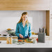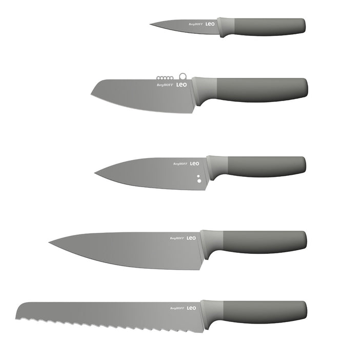 Add an extra touch of green into your kitchen with the recycled PP that's been used for the knife block and handles of this Leo Balance 6Pc Knife Block Set. With a perfect combo of modern design and practical features, this 6-piece knife block set is an asset in any kitchen. The knife block is equipped with a non-skid base for a secure placement and comes with a two-tone knife insert so you can alternate between grey and sage. Add to this the high-quality stainless-steel with non-stick coating and soft-grip handle and you’ll be cutting, slicing, and dicing your way around the kitchen in no time! This non-stick coating also ensures ingredients won't adhere to the blade during use. Keep your knives safely organized, sharp, longer and ready to use in this universal knife block which can store up to 8 knives. This set includes Paring knife 3.5", Vegetable knife 4.3", Small chef knife 5.5", Chef knife 7.5", Bread knife 8.5", Knife block 9" x 9.25" x 3".
