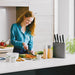 • The universal knife block is equipped with a removable insert and base for a fast and easy cleanup. Simply wash with mild soap and warm water to remove any residue or food particles. For tougher stains or stubborn debris, a gentle scrub with a sponge or nylon scrubbing pad is recommended. Avoid using abrasive scrubbing materials or harsh detergents for long lasting performance.