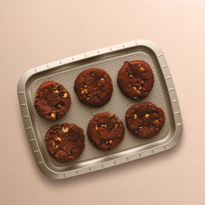 - Cookies, pastries or other delicious treats, you’ll easily bake them to perfection on this non-stick cookie sheet. Its diamond-textured bottom, which enhances air circulation during baking and ensures that your baked goods are cooked evenly for a consistent golden brown finish every time. The increased air flow also promotes a quick food release.