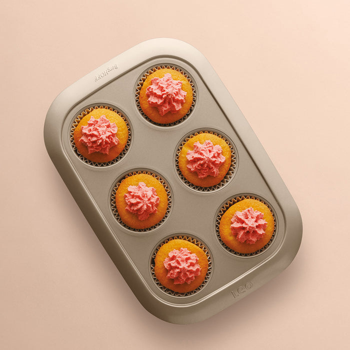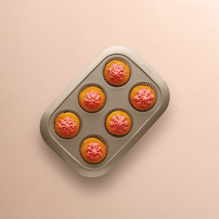 Sweet chocolate cupcakes, savory breakfast muffins or hearty scones, with this carbon steel Leo Balance 6-cup Cupcake Pan 2.5", you’ll make the most delicious delights in no time! Thanks to the even heat distribution, your batter bakes evenly and browns beautifully so you can enjoy the perfect little treat during Sunday brunch or as a quick snack. When you’re done, the tin’s FernoGreen, PFAS-Free, PTFE-Free, non-stick coating makes sure no food bits are left behind for effortless cleaning. This pan is evenly divided into 6 cups for easy control portion. The Leo carbon steel nonstick bakeware is built to endure high oven temperatures, reaching up to 450°F.