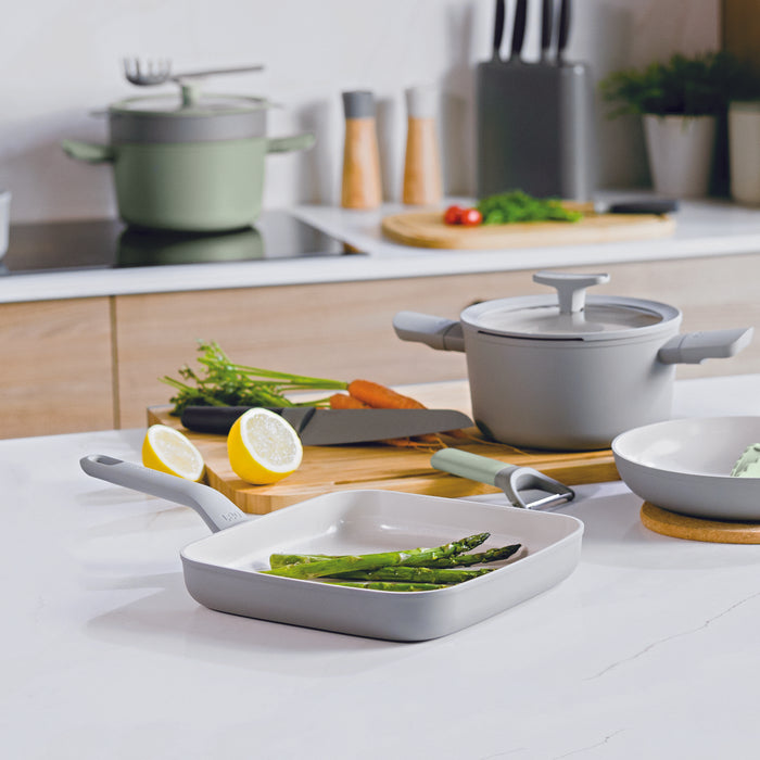 • Set includes 11" Frying Pan and 11" Square Grill Pan. Experience the ultimate cooking experience with our sustainable frying pan and grill pan, made with recycled Aluminum with a healthy CeraGreen non-stick ceramic coating and a long, ergonomically shaped stay-cool handle for a safe, firm grip for secure lifting and a large loop for easy storage.