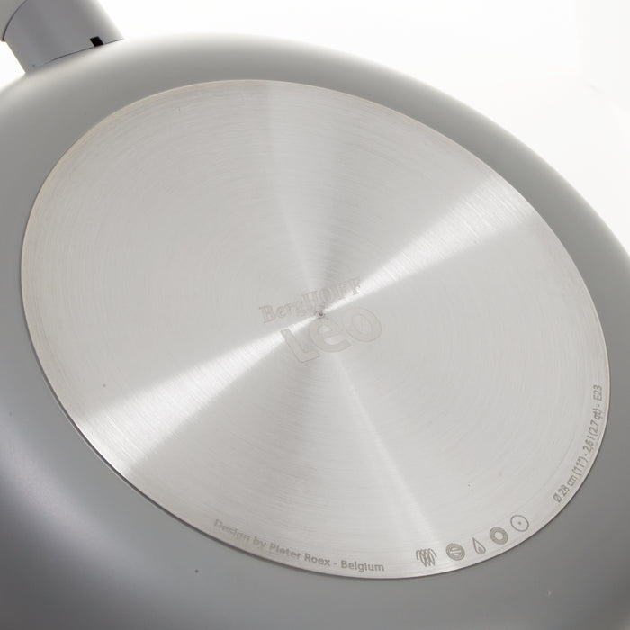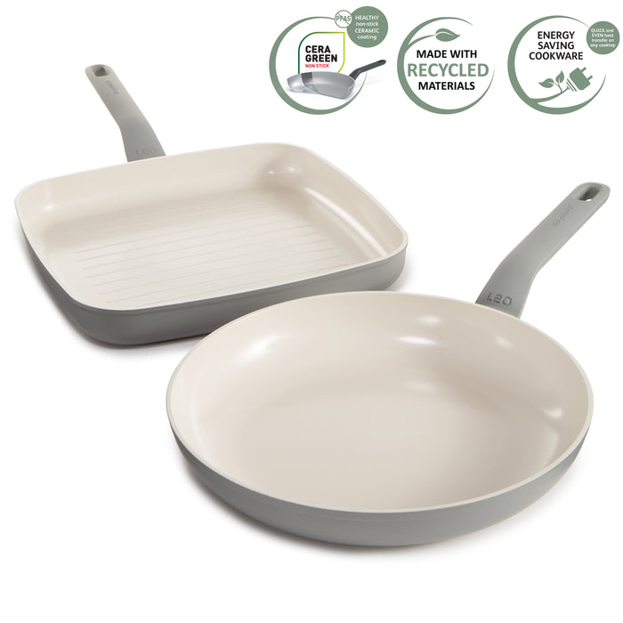 Leo Balance Fry and Grill pan set is built with sustainable and healthy non-toxic, PTFE free, PFAS free non-stick CeraGreen ceramic coating, recycled aluminum and stay-cool handle for no oil, no fat cooking. Whether you want to make breakfast for the entire family, brown a piece of meat or make a frittata, this set is up for the job. The grill pan's ridged base facilitates efficient fat drainage and slow cooking, locking in the natural juices of meats, poultry, seafood, fish, and vegetables. The sturdy stay-cool handle that’s soft to the touch provides a good grip so you can safely take the pan from the stove to the table for serving. The non-stick coating ensures easy food release and makes the pot a breeze to clean. Its full disk bottom ensures a fast and even heat distribution and retention. Compatible with a wide range of cooktops like Induction, Electric, Gas, Halogen, Vitro-ceramic, and Downdraft. Hand wash only. Package includes: Frying Pan 11", and Square Grill Pan 11".