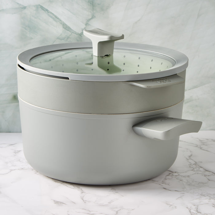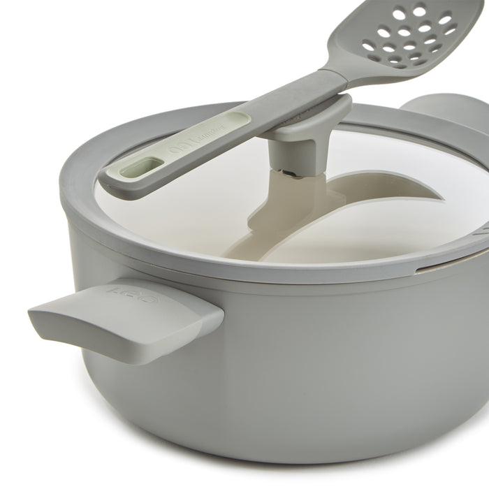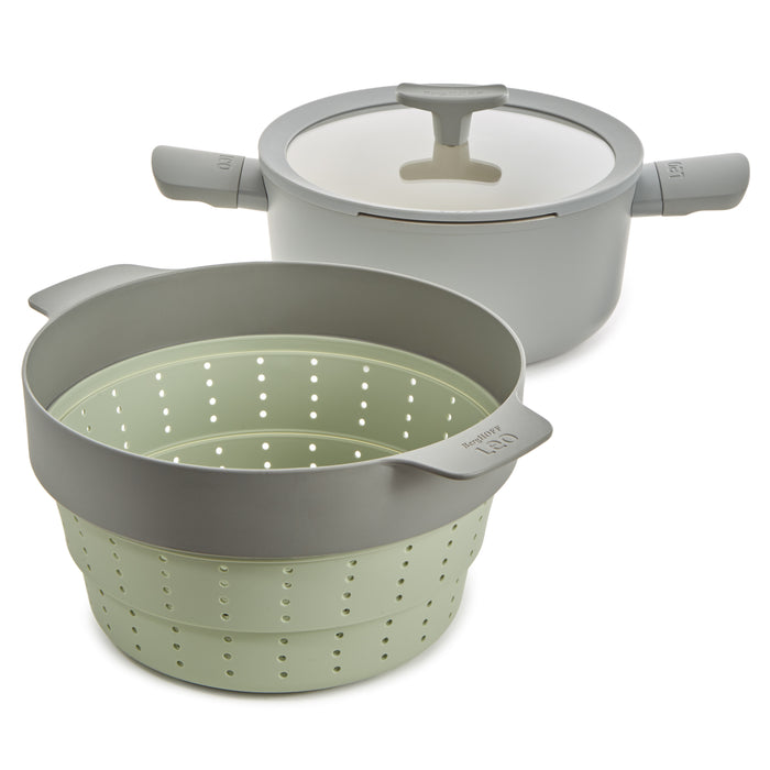 Leo Balance 3Pc Steamer Set is built with sustainable and healthy non-toxic, PTFE free, PFAS free non-stick CeraGreen ceramic coating, recycled aluminum and stay-cool handle for no oil, no fat cooking. Boil pasta, simmer soups, or slow-cook stocks with confidence! The pot is made from 100% recycled Aluminum body and full disk bottom that guarantee fast and even heat distribution for energy efficiency, suitable for all cooktops. Its soft-touch and stay-cool handle provides a good grip so you can safely take the pan from the stove to the table for serving. The versatile collapsible steamer insert is crafted from heat-resistant silicone and can be folded down to turn any 10" pot into a steamer. The glass lid allows you to keep an eye on cooking without having to lift the lid while the knob on the lid is equipped with a spoon rest to keep kitchen clean while cooking. This set includes Covered Stockpot 4.6qt., and Collapsible Steamer and Strainer 10".